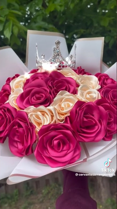 Majestuoso ramo compuesto por rosas artificiales en tonos fucsias y blancas, coronado con una delicada corona plateada que aporta un toque de elegancia y distinción. Ideal para ocasiones especiales como cumpleaños, aniversarios o celebraciones donde quieras hacer sentir a alguien como una verdadera reina.