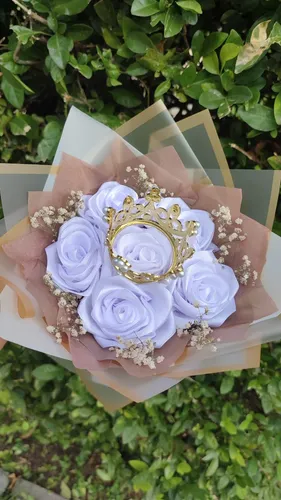 Este hermoso bouquet está compuesto por rosas artificiales blancas con un acabado satinado, acompañadas de pequeñas flores secas decorativas (tipo gypsophila) y coronado con una elegante corona dorada al centro, símbolo de distinción y aprecio. El envoltorio en tonos marrón claro y translúcido con bordes dorados le da un toque moderno y sofisticado. Perfecto para cumpleaños, celebraciones especiales o para hacer sentir a alguien verdaderamente como una reina.